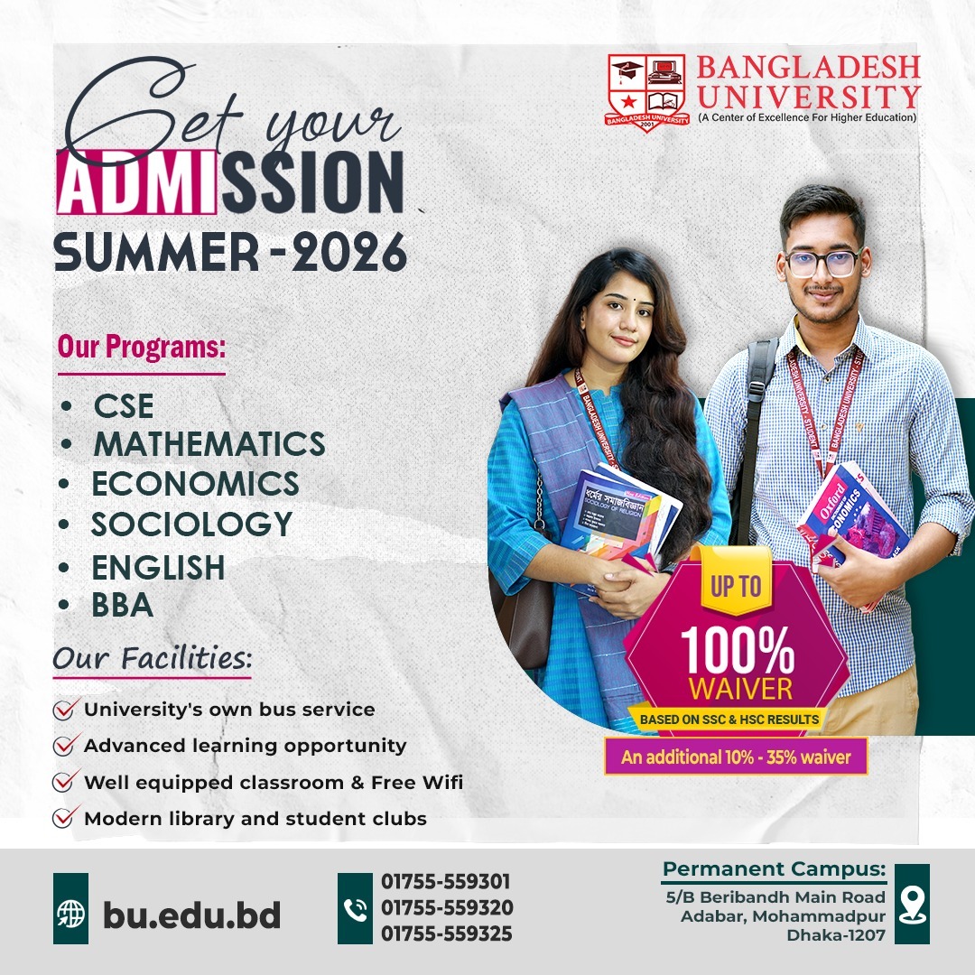 Bangladesh University (BU) started its journey in 2001. Since then it has been providing quality higher education at a minimum cost especially for the financially underprivileged. For more than a decade, BU has been increasing and nurturing talent within the youth with modern knowledge and technology. With the international affiliations, BU aims at making its students capable and ethical leaders to lead and represent our nation around the world.